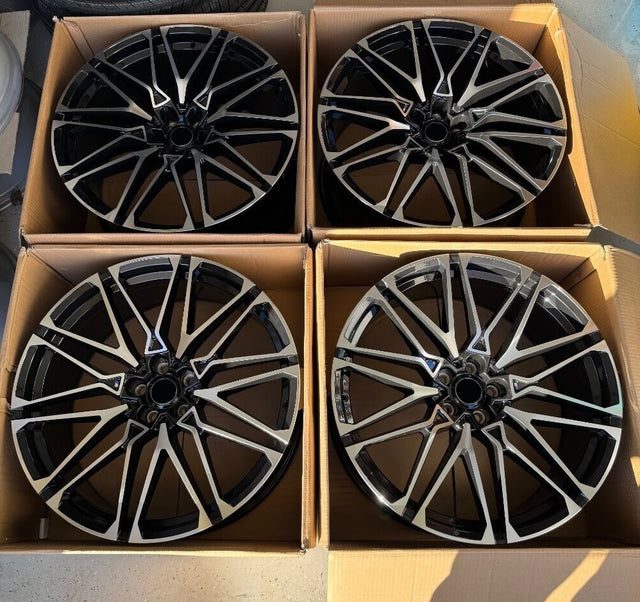 These new 22" Rims are a direct fit for the BMW X7 ranging from the years 2019, 2020, 2021, 2022, 2023, 2024 & 2025. These wheels are made in a high-quality weatherproof Gloss Black with Machined Face. These are staggered rims. The fronts are 22 x 9.5 & the rears are 22 x 10.5. These 22-inch wheels for the BMW X7 are an excellent direct-fit factory OE style wheel. These wheels are made from the same aluminum A356 alloy as the stock OEM wheel and hold the same JWL structural certification. This aftermarket replication factory style wheel also comes with 1-year structural warranty.
