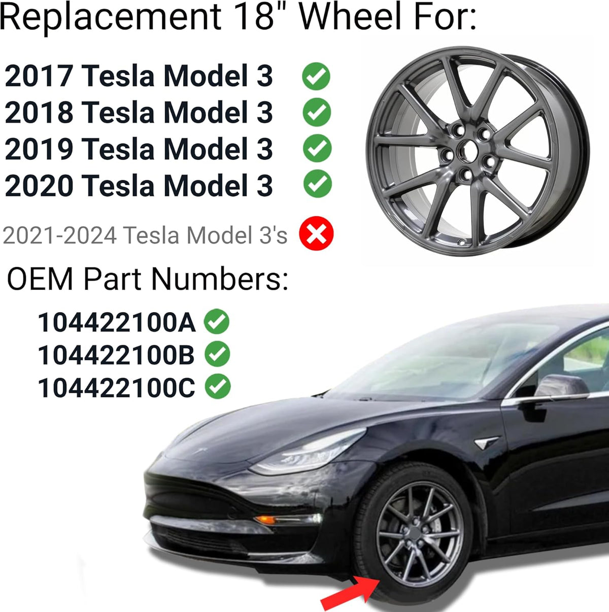 New Replacement 18-Inch Rim For Tesla Model 3 (2017–2020) – OE Style Aluminum Alloy Wheel | 18x8.5" | Direct Fit Factory Match for Tesla Part #104422100A 104422100B 104422100C